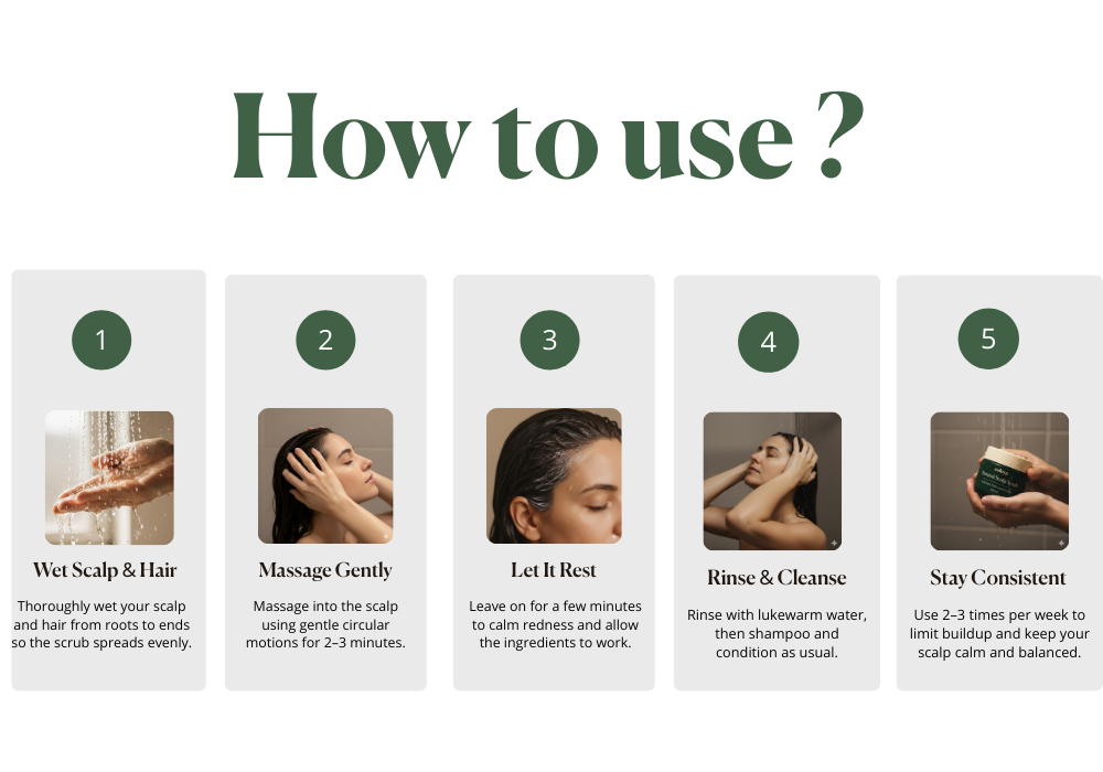 Start by using it 2–3 times per week on a wet scalp, before shampooing. Gently massage for about 2–3 minutes, then rinse thoroughly. As your scalp becomes more comfortable and balanced, many people naturally reduce use to 1–2 times per week.