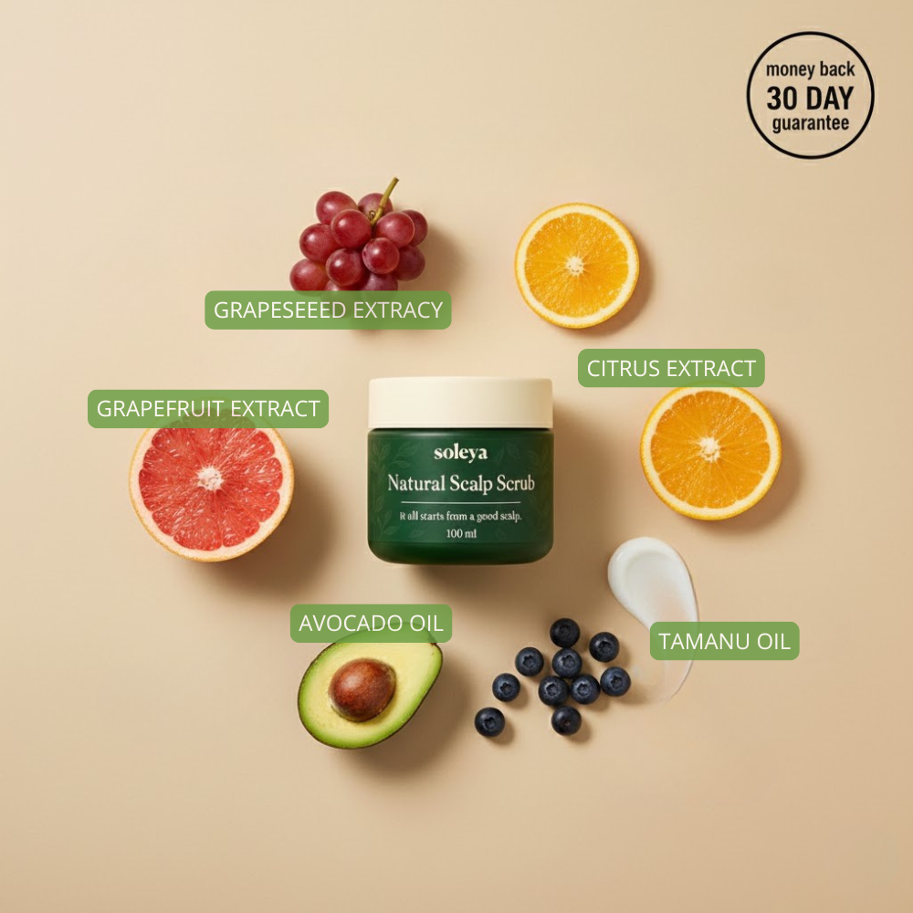 Our Natural Scalp Scrub is built around a gentle, triple-action approach designed to support long-term scalp comfort and balance, especially for people struggling with scalp psoriasis.